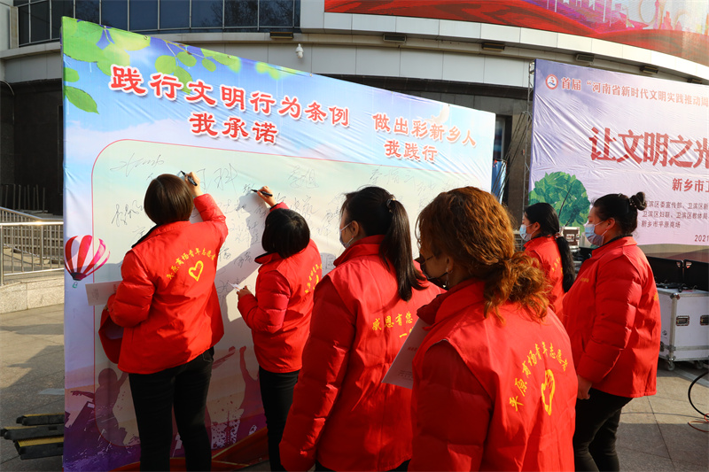 活動當(dāng)天,商場各樓層的志愿者們參與其中,在新鄉(xiāng)市道德模范,商場黨委副書記、總經(jīng)理朱嵐嵐發(fā)表“踐行文明行為條例,做出彩衛(wèi)濱人”倡議后,大家積極響應(yīng)倡議,紛紛在承諾墻上簽名,并表示要以身作則,從自身做起,從影響身邊人做起,推動《河南省文明行為促進(jìn)條例》的貫徹落實,為新鄉(xiāng)城市文明程度的提升貢獻(xiàn)一份力量。