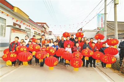 春風(fēng)和煦,村里的孩子撐開剛剛送來的紅燈籠,用手舉著來回嬉鬧,高興得又蹦又跳,他們圍在朱嵐嵐身邊,搶著與前來送燈籠的朱嵐嵐阿姨合影。