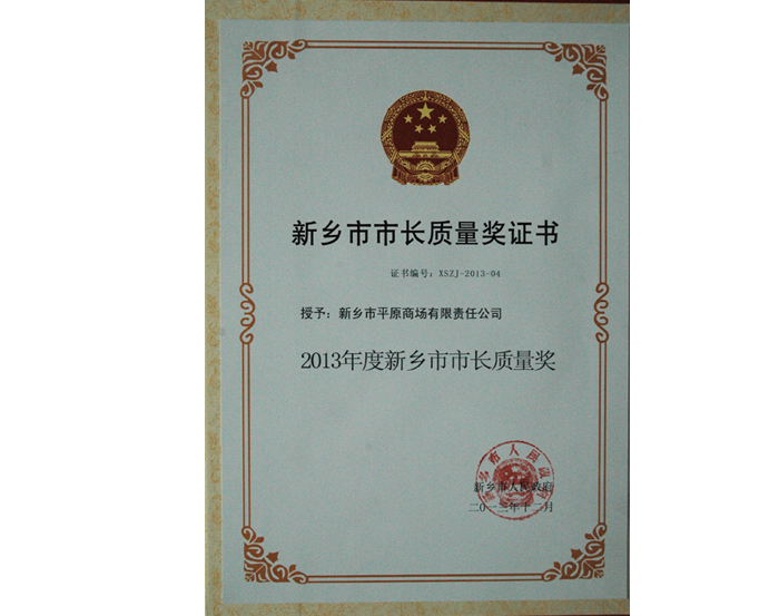 新鄉(xiāng)市市長(zhǎng)質(zhì)量獎(jiǎng)證書(shū)