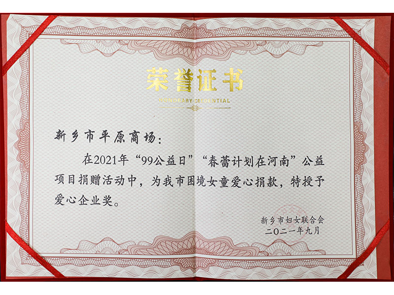 “99公益日”“春蕾計(jì)劃在河南“愛(ài)心企業(yè)榮譽(yù)證書(shū)