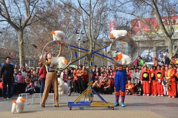 表演中,《中州大鼓》敲出新年滿堂彩;《舞龍》、《舞獅》舞出吉祥好喜氣;《鬧社火》中毛驢、旱船齊舞動(dòng),一派喜氣洋洋;《武高蹺》扭出喜樂新春的“高”節(jié)奏;平均年齡在六十五歲以上的《抖空竹》老年隊(duì),展示出別樣的夕陽之美、運(yùn)動(dòng)之樂;登上2018央視春晚的訓(xùn)狗師喬麥元和他的狗狗們也到場(chǎng)助力添彩,狗狗們憨態(tài)可掬、呆萌討巧的演出,逗得在場(chǎng)觀眾開懷大笑;商場(chǎng)特別邀請(qǐng)到的毛澤東、蔣介石、宋慶齡等幾位特型演員的情景演出,為大家?guī)矸氯舸┰綒v史的感受。他們還頻頻與現(xiàn)場(chǎng)觀眾互動(dòng),引得廣大市民熱情點(diǎn)贊,爭(zhēng)著搶著要與他們合影留念。