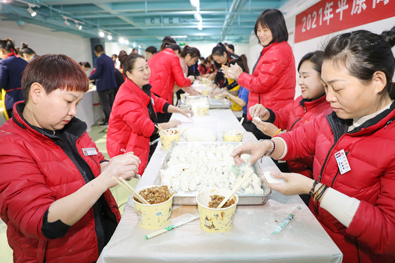 8點余鐘,隨著員工陸續(xù)入場,各個樓層熱氣騰騰的餃子新鮮出鍋,處處飄散著濃濃的香味兒。員工們紛紛尋香而來,興奮地歡呼雀躍,圍坐在一起,幸福地品嘗起“平原牌”餃子,清晨的凜冽寒冷被這層層暖意融化。