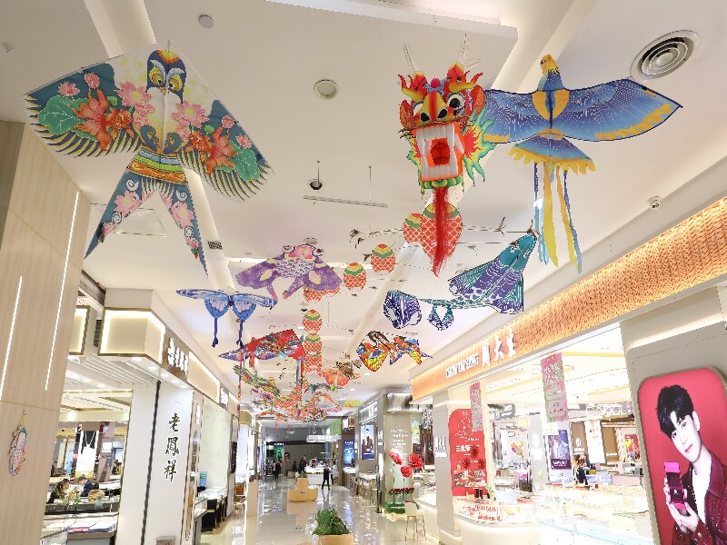 一樓的通道上方,近百款大大小小、各式各樣的觀賞風(fēng)箏,五顏六色、爭(zhēng)奇斗艷,通過傳統(tǒng)風(fēng)箏精美的圖案、獨(dú)特的造型,為顧客帶來不一樣的視覺盛宴。中庭上空飛揚(yáng)的風(fēng)箏:鳳凰、錦鯉、沙燕、蝴蝶、金魚等傳統(tǒng)造型,帶著吉祥寓意的圖案,一派生機(jī)盎然、讓人流連忘返。